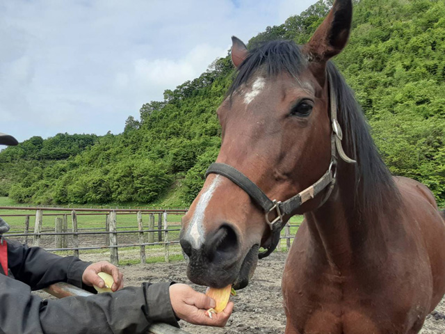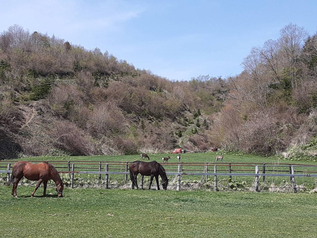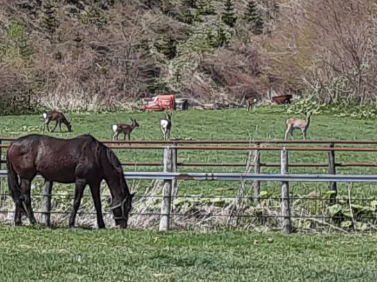 奥で鹿が青草を食べています。 あの場所は馬たちを放牧していないので鹿のみなさんは青草食べ放題フェアを満喫中。