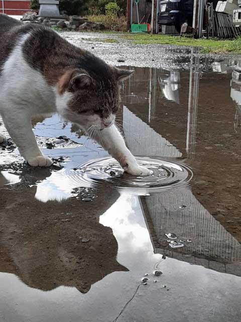 ある雨の日。 水たまりを歩く?遊ぶ?猫。 最近よく遊びに来ます。 猫は水が苦手といいますが、そうでもない様子。 十猫十色。