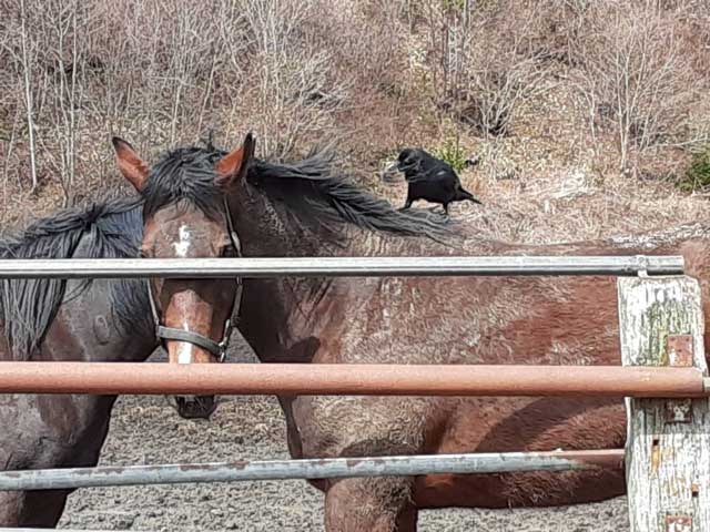 カラスが巣作りようにたてがみを泥棒中・・・。 気にする素振りも見せず取り(取られ)放題。 ・・・それにしても泥だらけ(苦笑)