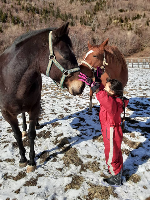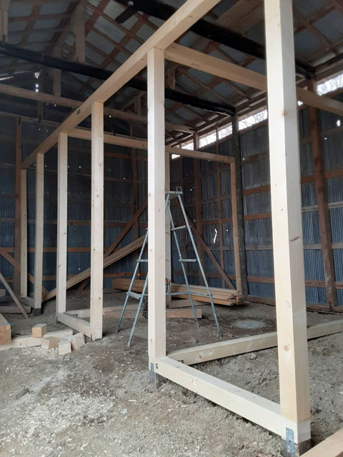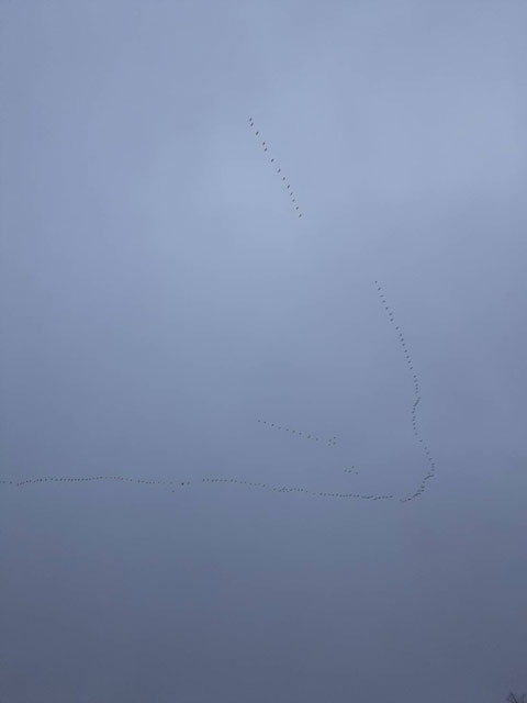 先日、空に白鳥の群れが…(よく見ると点々となっているやつ) 春ですねー 厩舎造りも着々と進んでいます。