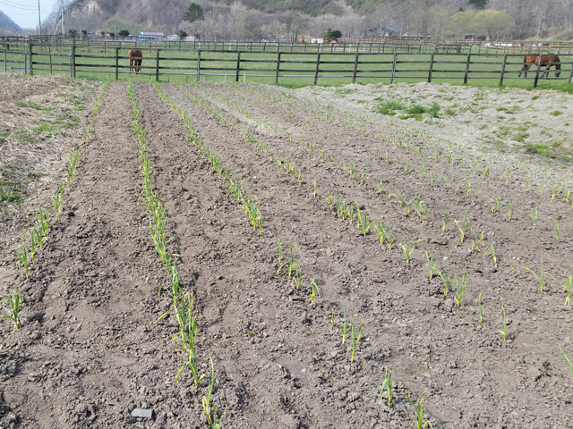 先日、にんにくとにんにくの間に追肥作業を行いました。茶色いのが肥料です。