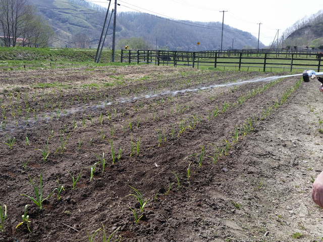 雨で畑に肥料が浸透していきますが、追肥を行う数日前から晴天が続き土が乾いていたので水をまきました。