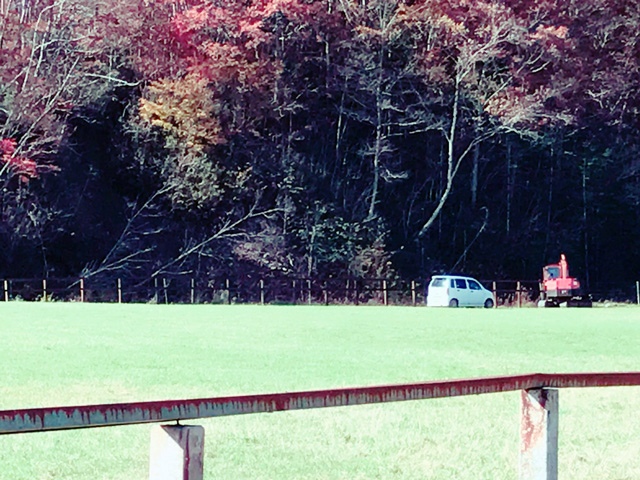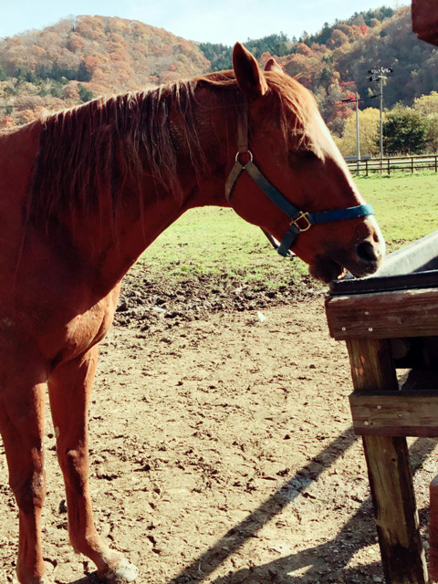 場長に作ってもらった水飲み台をグイをするハッピー・・・ そして、山側の放牧地の牧柵打ちも始まりました。