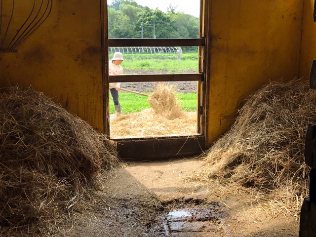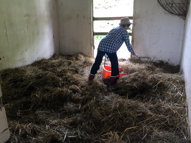 この後、バケツを洗い、切り草と水を入れて、天日干しした寝藁と新しい寝藁を馬房にいれ、通路のお掃除をします。(ここまでが午前中の作業)↓