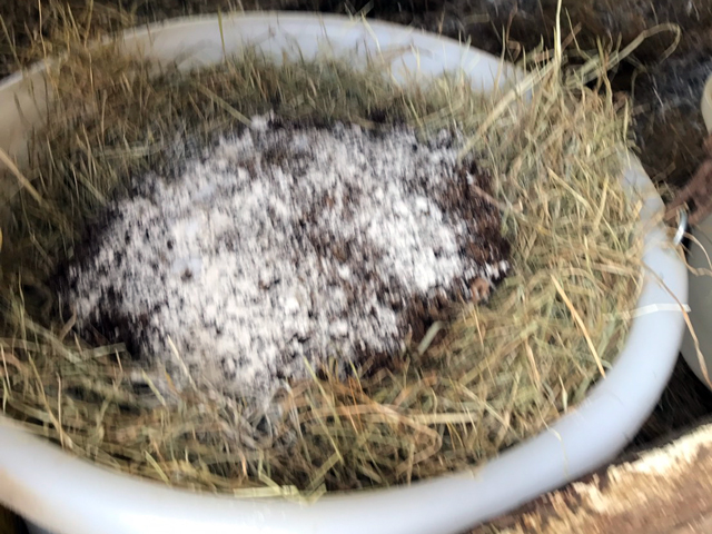 午後は、馬たちを厩舎に戻す前に、えん麦、ビートパルプ、そして、カルシウムと塩を振りかけて夕方の飼葉を作ります。↓