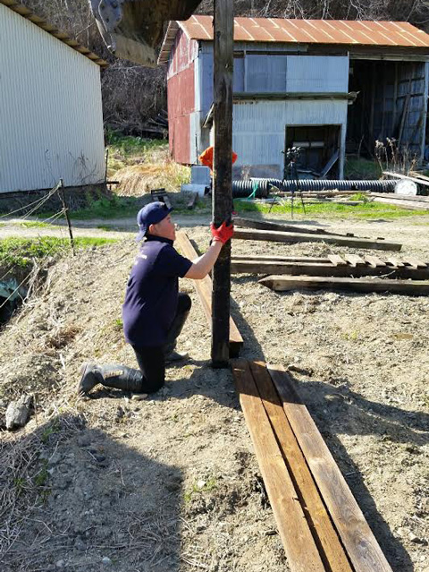 使っていない重~い牧柵の支柱を放牧地からどかす為トラクターに乗せる作業中。