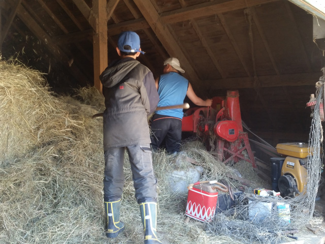 馬たちにあげる切り草もロールにした藁をほぐしてベルトに乗せる人、ベルトに乗った藁をカッターの部分にまんべんなく送り込む人と手際良く作ってくれます。