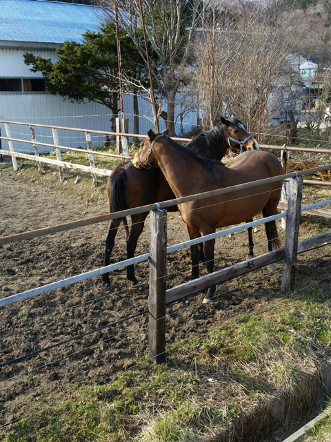 ↑馬たちは暖かくなり活動的になってきました。ピンは現役時代にケガをした腰が傷み、寒い時期はあまり遠くまで行かなかったのですが、今は放牧地のずっと奥まで歩いたり走ったりしています。