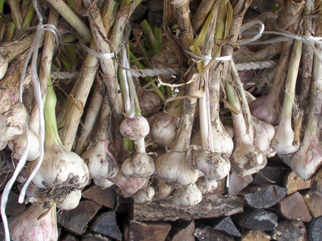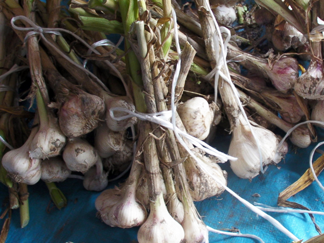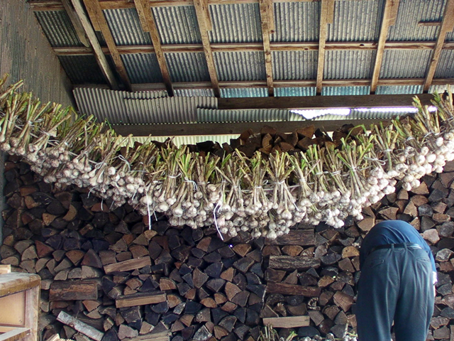 葉と根を切って干されるのを待つにんにく達。↓