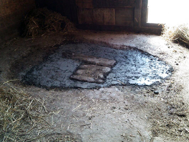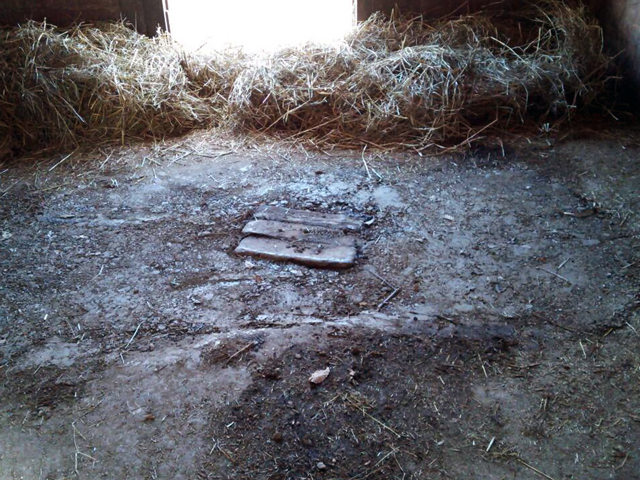 馬がオシッコをしたあと、オシッコがこの穴に寝藁をつたい集まってくるように穴に向かって少しだけ傾斜をつけた作りになっています。
