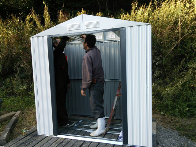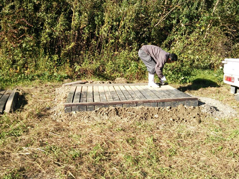 写真は古い牧柵が刺さったままですが、今は取ってこれを物置の土台にしました。