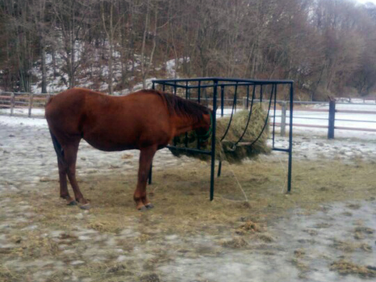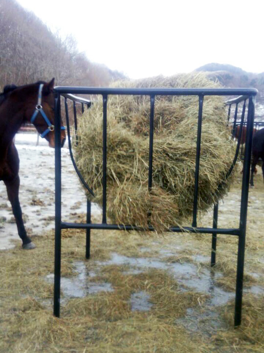 昨年末、皆様からいただいたご支援の一部を使い、放牧地に置く干し草のカゴを牝馬とセン馬用に2つ購入させていただきました。